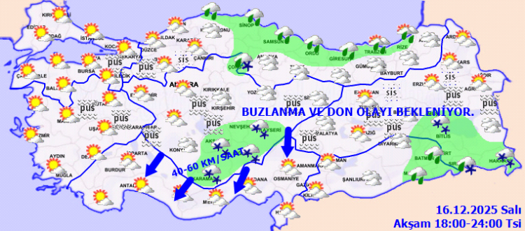 Yağışların, Orta Karadeniz kıyıları, Sinop çevreleri ile Kastamonu kıyılarında yer yer kuvvetli olması bekleniyor. Sabah ve gece saatlerinde buzlanma ve don ile birlikte Marmara’nın doğusu, Ege, iç ve doğu kesimlerde pus ve yer yer sis hadisesinin görüleceği tahmin ediliyor.
